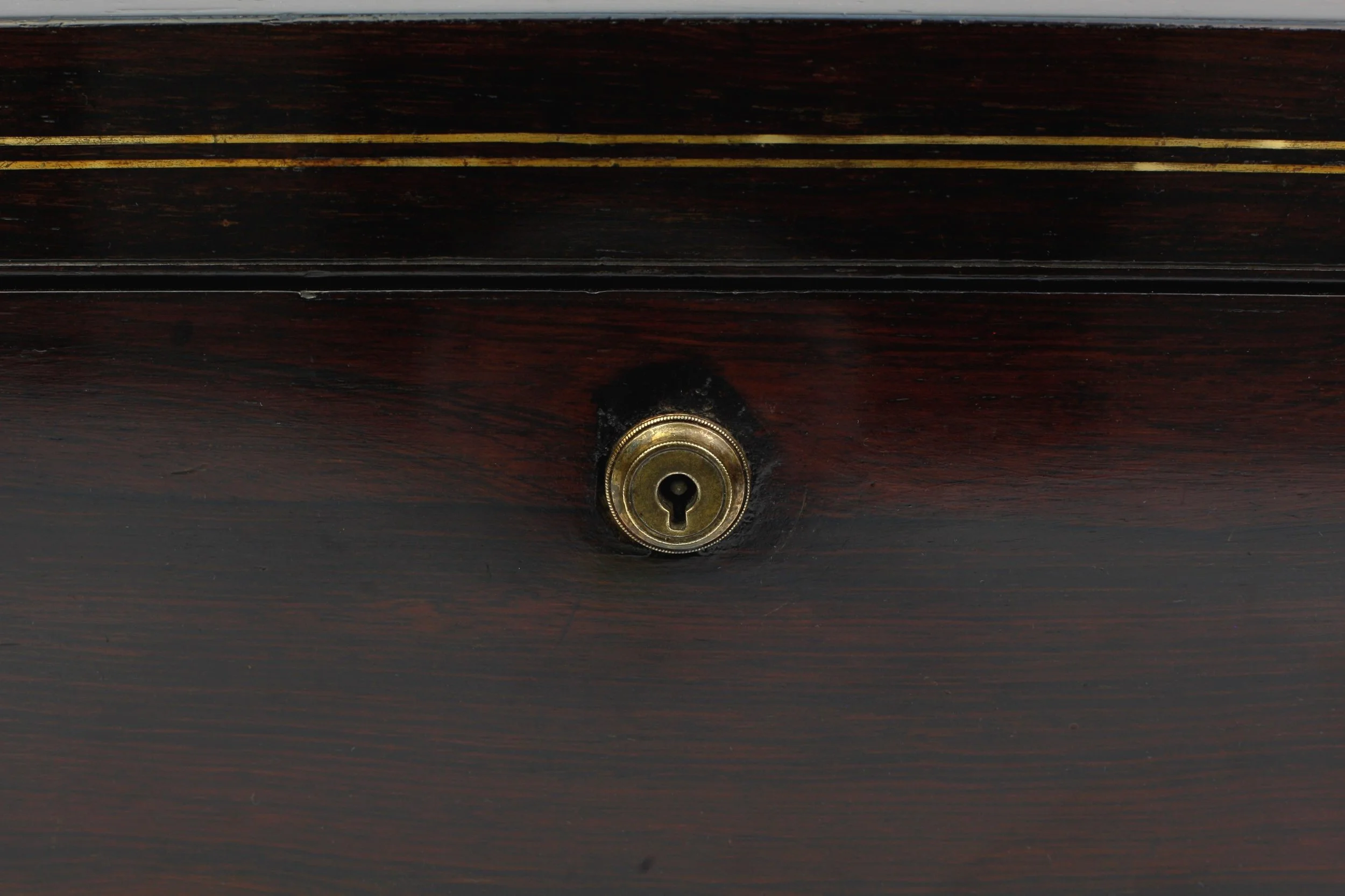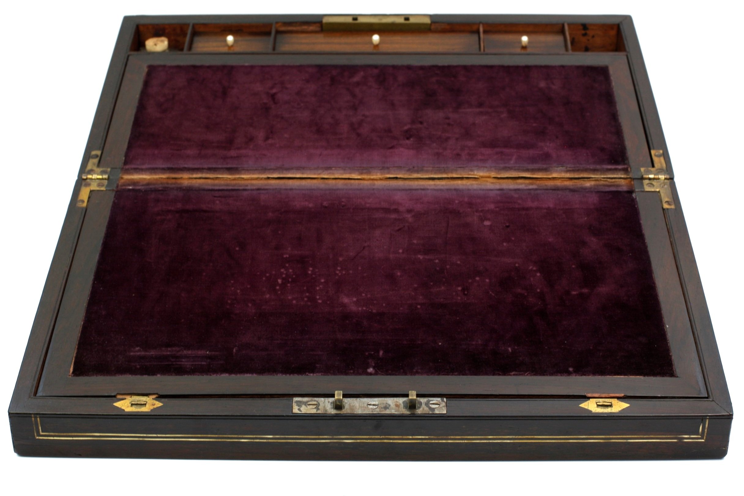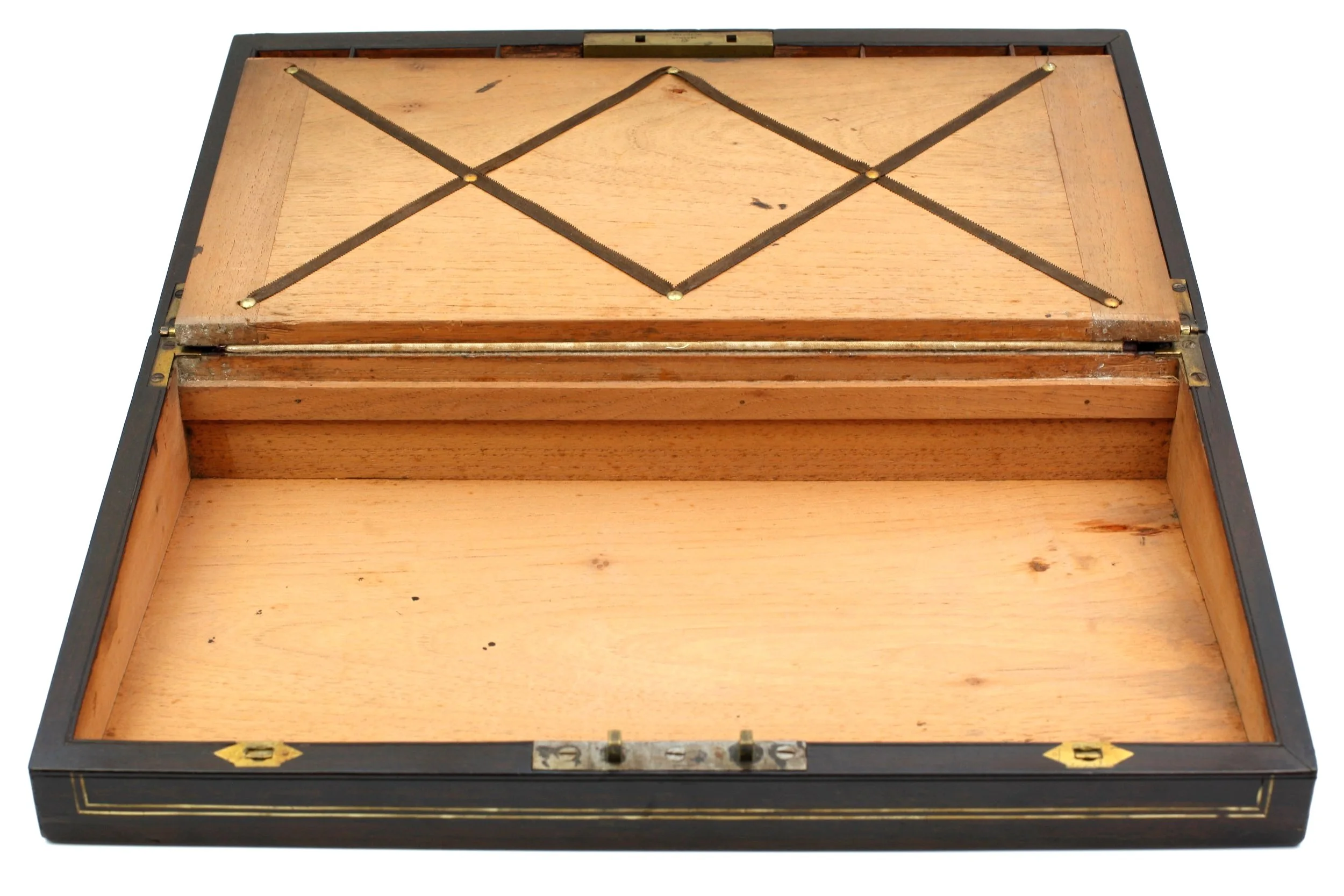 A slope was an important apparatus for any British officer to include in their kit as it provided a useful hub for the sending of daily correspondences, the writing of orders, and for keeping monetary affairs in order. Campaign items such as this are always highly desired by the market, not just for their worth as display furniture but also for their historical connections. Indeed, the lock helps us date this item to the late-1700s and so it could possibly have been taken to the Peninsula War or even America - who knows? What is for certain is that, for a 200-year-old item, it is in superb shape.