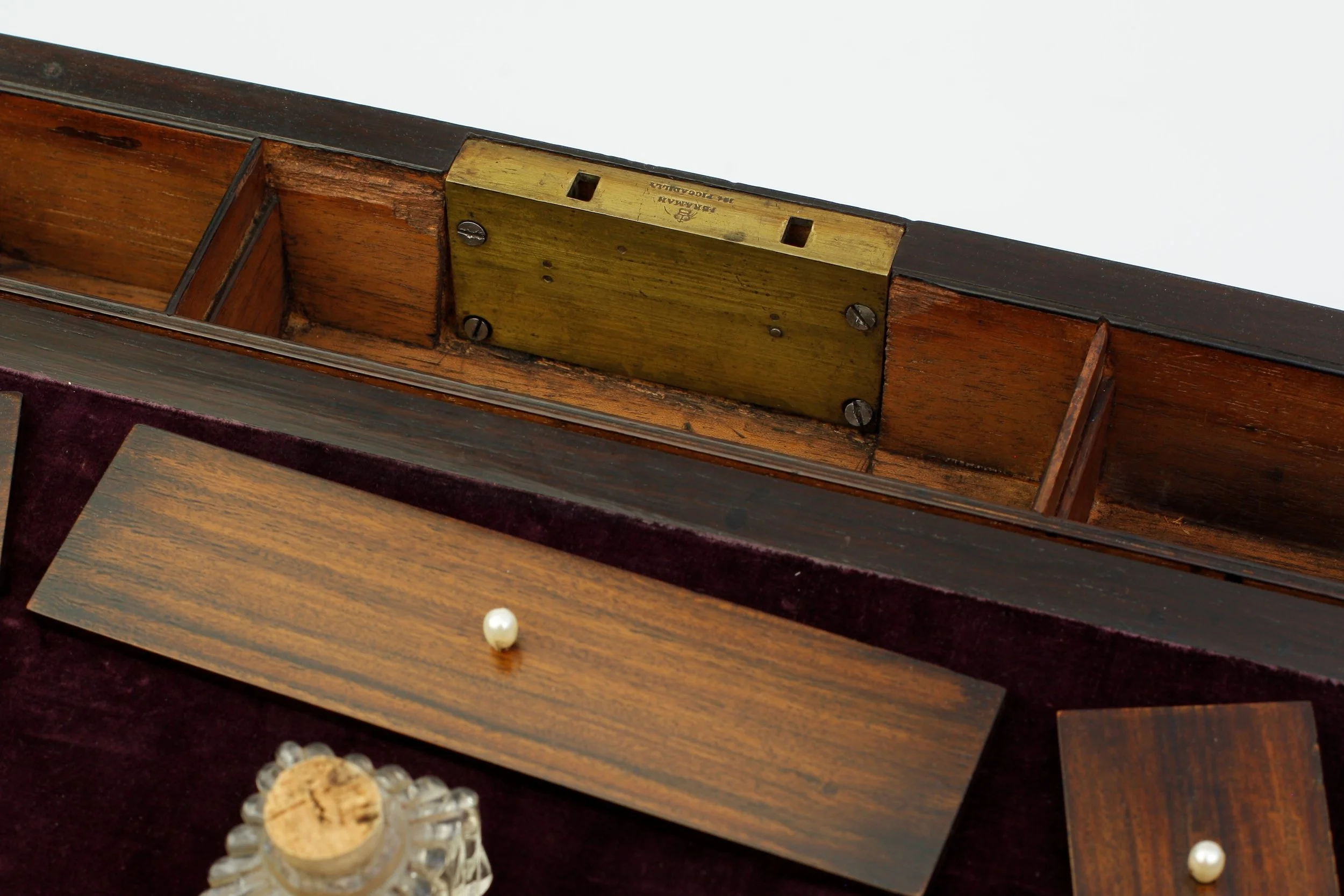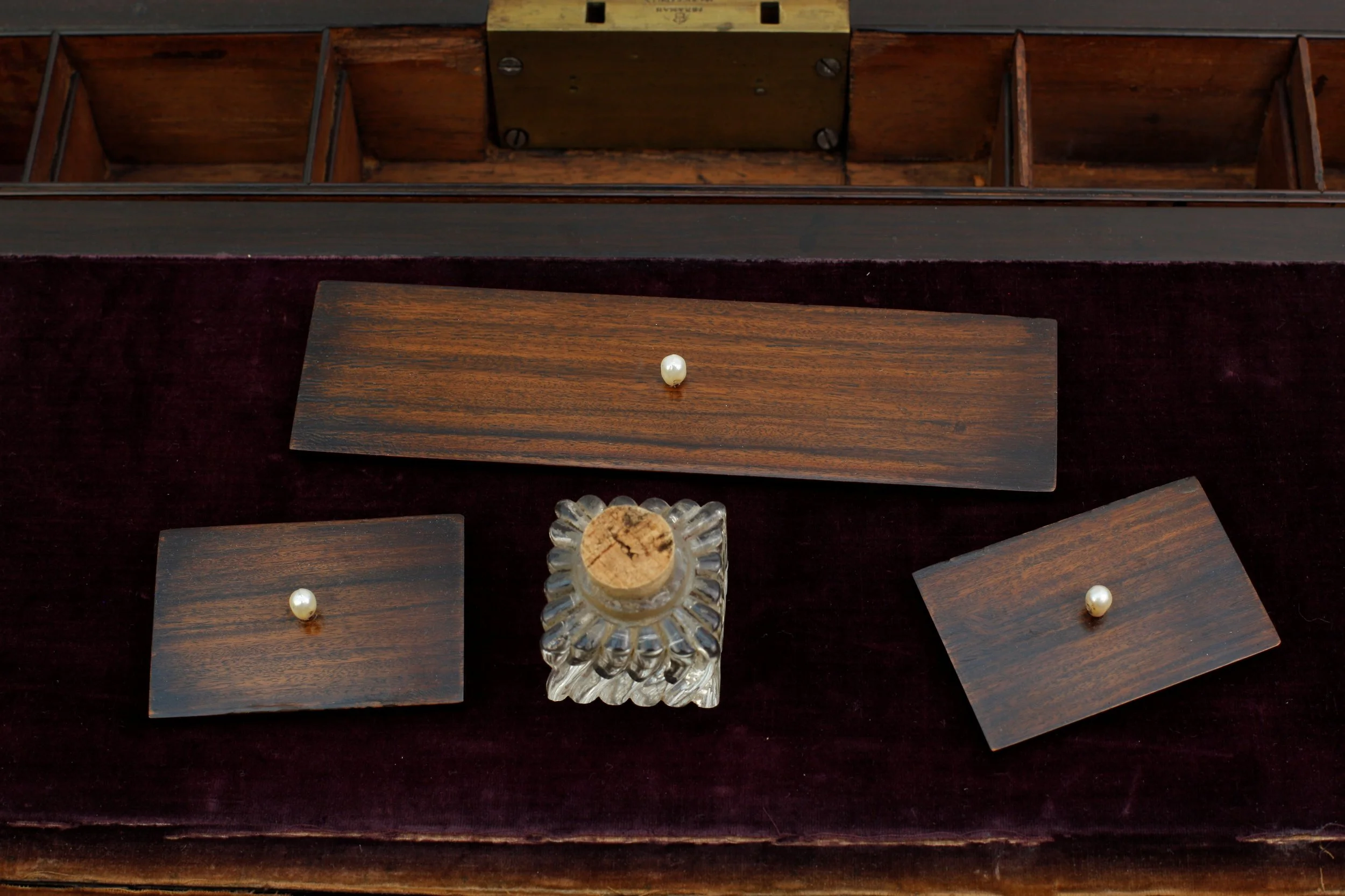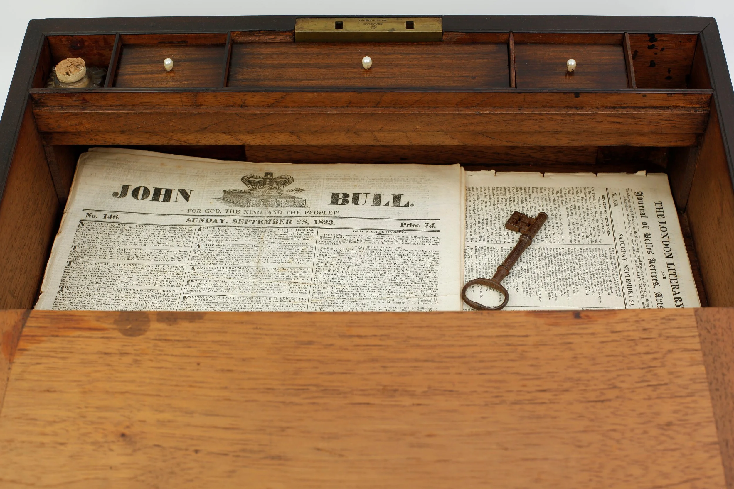 Everything is in good working order with this example: the hinges are healthy, the interior wood is in super condition, the compartments have wooden covers with small mother of pearl handles and the velvet writing surface is an antique original. The slope also comes with a few period-correct effects: an inkwell, some early 19th-century newspapers and some hand-written letters. I always try to list the bad points of an item along with the good ones but there aren’t really any to speak of in this case. The only real problem is that the original key is missing but then replacement Bramah keys, both new and antique, are available online, I just haven’t got around to sourcing one.